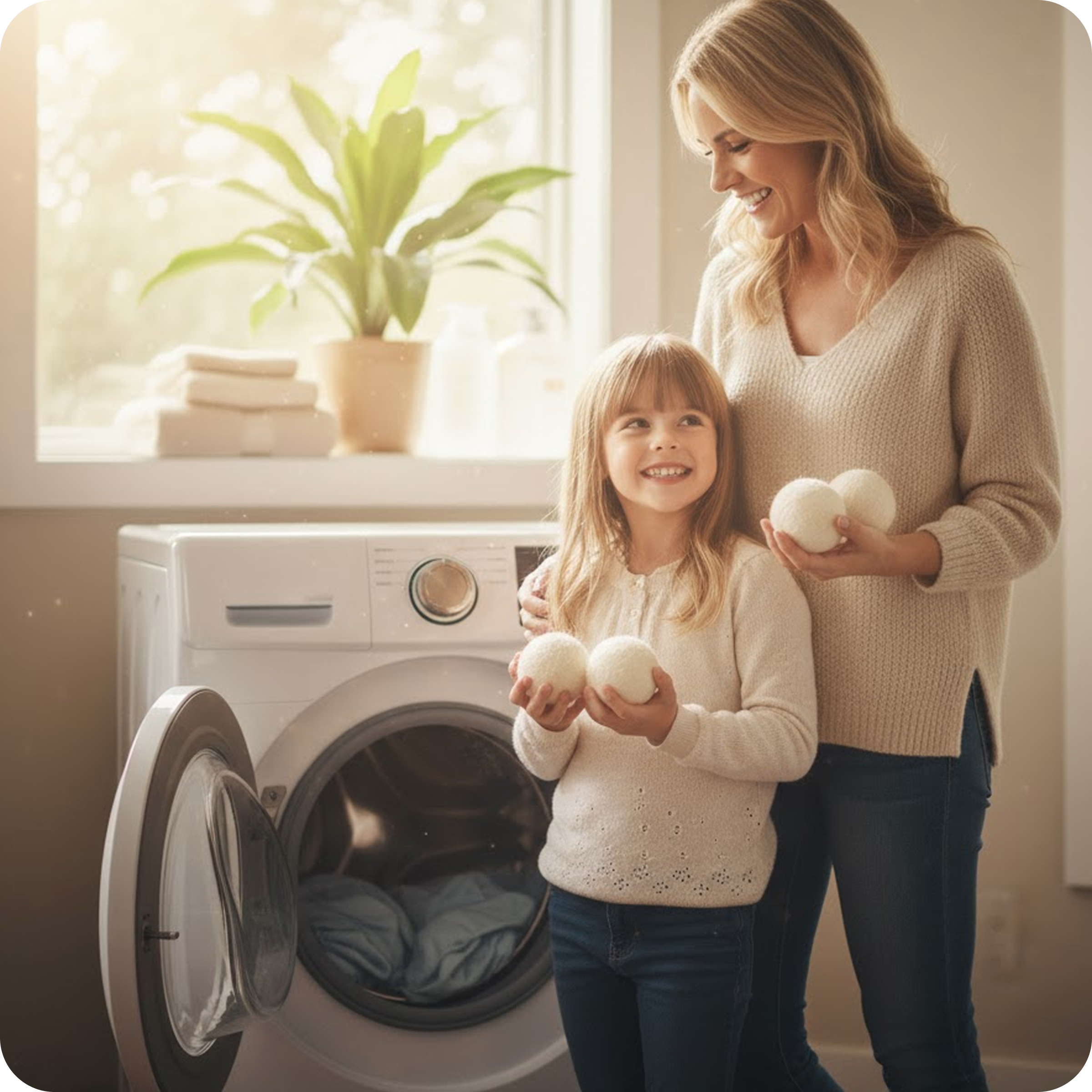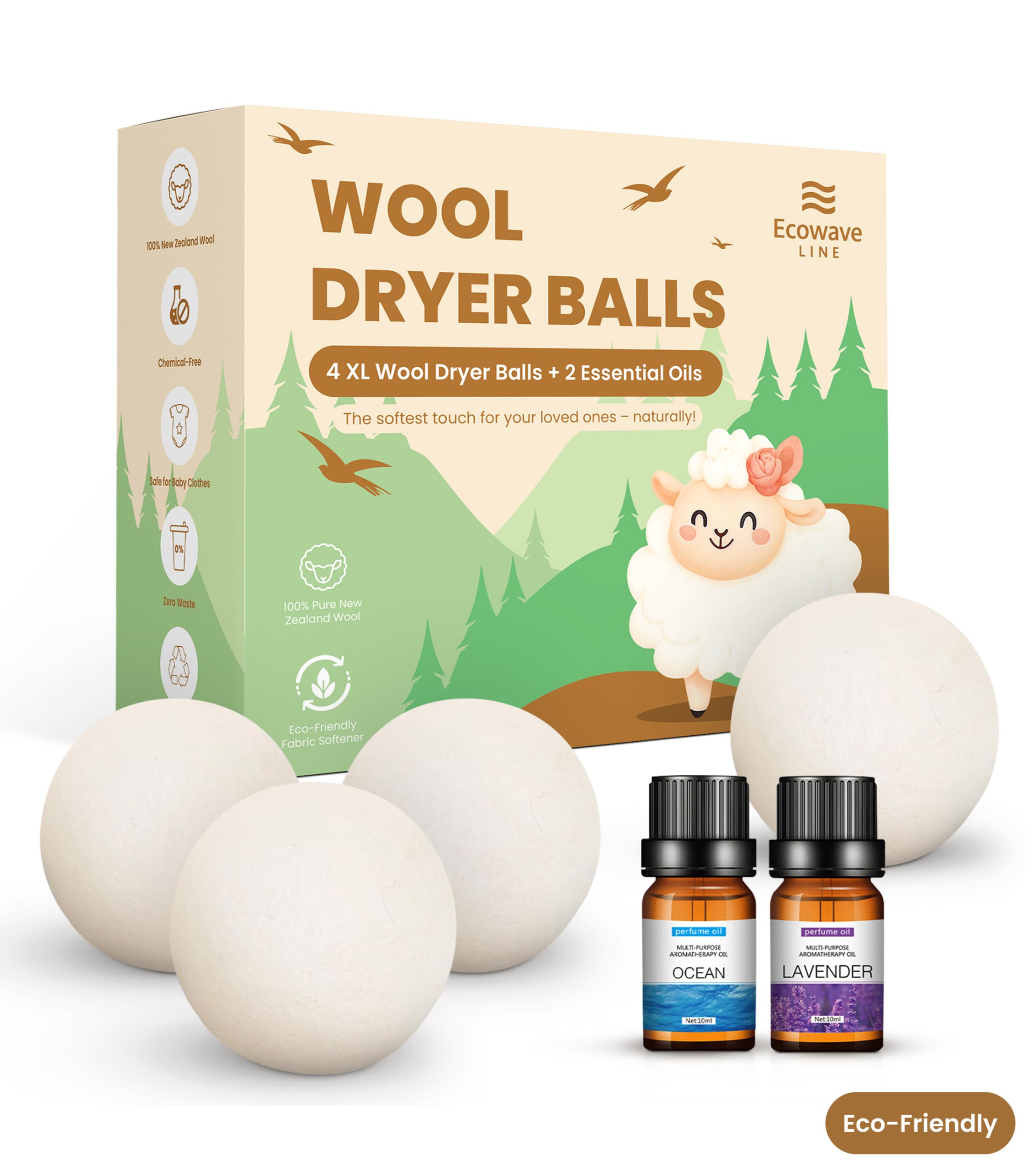 Naturally soften your laundry without chemicals or single-use sheets. Each wool dryer ball is handmade from 100% New Zealand wool — a pure, natural fabric softener that reduces drying time, saves energy, and keeps your clothes fresh. Paired with two essential oils (Lavender & Ocean Breeze), they bring a calming scent and warmth to every home.